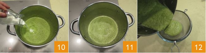 Fügen Sie die frische Sahne hinzu 10, mischen Sie und kochen Sie alles noch etwa zehn Minuten 11, danach gießen Sie Ihre Zucchinisuppe durch ein Sieb 12