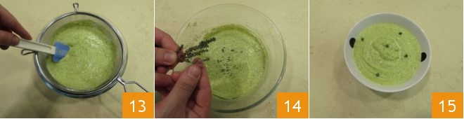 und passieren Sie sie, um eine glatte Konsistenz zu erhalten 13. Fügen Sie die Thymianblättchen zur Aromatisierung hinzu 14, richten Sie das Gericht an und servieren Sie Ihre Zucchinisuppe 15!