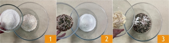 Um das zuckerfreie Granola zuzubereiten, geben Sie zuerst die Haferflocken und die Kokosraspeln in eine Schüssel 1. Fügen Sie die gemischten Samen 2 und die Mandelblättchen hinzu 3.