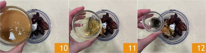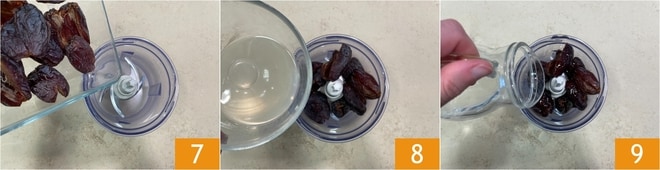 Geben Sie die Datteln in einen Mixer 7, fügen Sie das Kokosöl 8 und das Wasser hinzu 9.