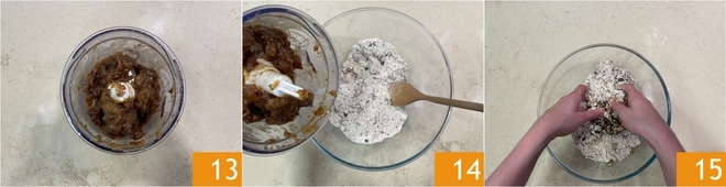 Mixen Sie alles, bis eine grobe Creme entsteht 13; geben Sie sie in die Schüssel mit der Haferflocken-Kokos-Mischung 14 und kneten Sie mit den Händen 15.