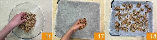 Sie sollten eine homogene Mischung erhalten 16 und sie auf ein mit Backpapier ausgelegtes Backblech bröseln 17. Keine Sorge, wenn einige Stücke größer sind als andere 18.