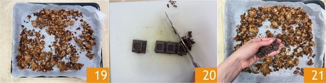 Backen Sie im vorgeheizten statischen Ofen bei 170°C für 20-25 Minuten, dabei zur Hälfte der Zeit umrühren. Dann herausnehmen und abkühlen lassen. In der Zwischenzeit die Zartbitterschokolade grob hacken 20, dann zum Granola hinzufügen 21.