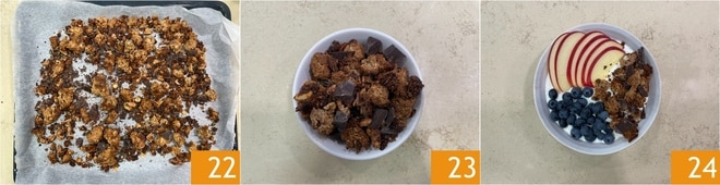 Das zuckerfreie Granola ist fertig 22; Sie können es in Milch, pur 23 oder zur Anreicherung des Joghurts 24 genießen.