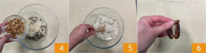 Fügen Sie die Walnüsse hinzu 4, eine Prise Salz und mischen Sie gut 5. Nehmen Sie die Datteln, schneiden Sie sie in der Mitte auf und entfernen Sie den Kern 6.