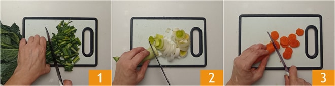 Um die Schwarzkohlsuppe zuzubereiten, putzen Sie zuerst den Schwarzkohl und schneiden Sie die Blätter in Stücke 1. Entfernen Sie den grüneren Teil des Lauchs und die erste Schicht, dann schneiden Sie ihn in 1 cm dicke Ringe 2. Schälen und putzen Sie die Karotte und schneiden Sie sie ebenfalls in 1 cm dicke Ringe 3.