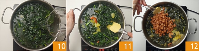 Bedecken Sie alles mit Wasser 10, würzen Sie mit Salz und setzen Sie das Kochen bei schwacher Hitze für 30 Minuten fort, dabei gelegentlich umrühren 11. Wenn noch 10 Minuten bis zum Ende der Kochzeit verbleiben, fügen Sie die Borlotti-Bohnen hinzu, gut abgetropft von ihrer Konservierungsflüssigkeit 12, und garen Sie sie fertig. Servieren Sie die Suppe und vervollständigen Sie sie mit einem Schuss rohem Olivenöl. Ihre Schwarzkohlsuppe ist servierbereit, vielleicht begleitet von ein paar Croutons oder geröstetem Brot!