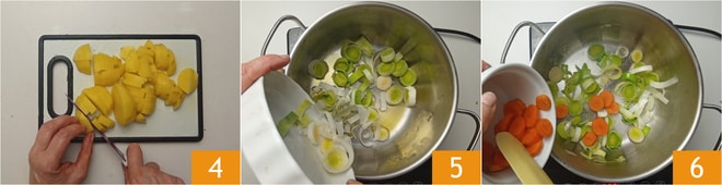 Schälen Sie die Kartoffeln und schneiden Sie sie in Würfel von etwa 3 cm 4. Geben Sie das Öl in einen Topf, fügen Sie den Lauch hinzu 5 und braten Sie ihn eine Minute lang an. Fügen Sie die Karotten hinzu 6 und kochen Sie weiter eine Minute lang.