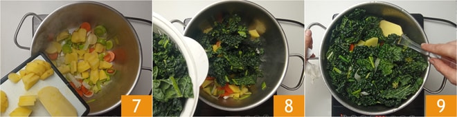 Fügen Sie die Kartoffeln hinzu 7 und lassen Sie sie 5 Minuten bei schwacher Hitze schmoren. Fügen Sie schließlich den Schwarzkohl hinzu 8 und mischen Sie alles 9.