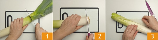 Um die Lauchsuppe zuzubereiten, entfernen Sie zuerst das grüne Teil des Lauchs 1, schneiden Sie die Wurzeln ab 2 und entfernen Sie die äußersten Blätter 3.