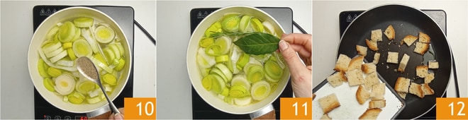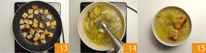 Bei mittlerer Hitze 2 Minuten kochen 13, dabei häufig wenden, um ein Anbrennen zu vermeiden. Kurz vor Ende der Garzeit etwa die Hälfte der Zutaten mit einem Stabmixer pürieren 14, um eine noch dickere Suppe zu erhalten. Die Suppe anrichten und mit dem gerösteten Brot vervollständigen. Ihre Lauchsuppe ist bereit zum Servieren 15.