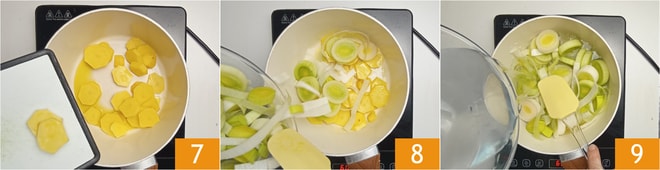 Erhitzen Sie in einer Pfanne das Öl, fügen Sie die Kartoffeln hinzu 7 und braten Sie sie 2 Minuten an. Gießen Sie die Lauchstangen ab, fügen Sie sie in die Pfanne hinzu 8, rühren Sie um und kochen Sie weitere 2 Minuten. Gießen Sie Wasser hinzu, um die Zutaten zu bedecken 9.