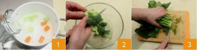 Um die Frankenstein-Suppe zuzubereiten, geben Sie den geschälten und in ziemlich große Stücke geschnittenen Sellerie und die Karotte in einen Topf, fügen Sie das Wasser und eine Prise Salz hinzu 1; bringen Sie es zum Kochen und säubern Sie in der Zwischenzeit den Brokkoli, entfernen Sie die Röschen vom Hauptstiel und geben Sie sie in eine Schüssel 2. Waschen Sie den Spinat, entfernen Sie den härteren Teil des Stiels 3 und legen Sie ihn beiseite.