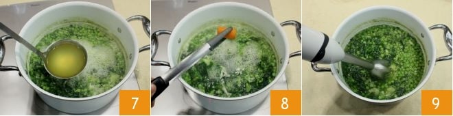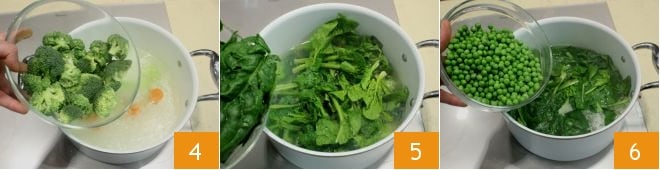 Wenn das Wasser kocht, geben Sie die Brokkoliröschen hinzu 5, lassen Sie sie etwa 5 Minuten kochen, dann fügen Sie den Spinat hinzu 6 und schließlich die Erbsen 6.