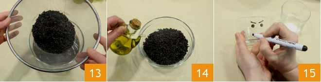 Einmal gekocht, den Venere-Reis abgießen 13 und mit einem Schuss Olivenöl anrichten 14. Alles ist bereit, um die Suppe zusammenzustellen: Nehmen Sie breite Gläser mit einem Fassungsvermögen von etwa 190 ml und zeichnen Sie mit einem schwarzen Stift die markanten Gesichtszüge von Frankenstein: leicht gebogene Augenbrauen, Augen und Mund 15;