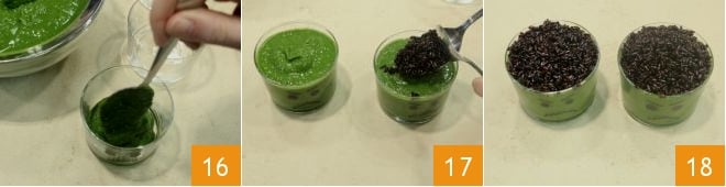 dann portionieren Sie die Suppe in die Gläser 16 und garnieren die Oberfläche mit ein paar Esslöffeln Venere-Reis 17: Das werden die Haare von Frankenstein sein. Ihre Frankenstein-Suppe ist bereit, Ihre Kinder zu überraschen 18!