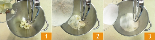 Um die zweifarbige Torte zuzubereiten, kümmern Sie sich zuerst um den Mürbeteig. Schneiden Sie die kalte Butter in Würfel und geben Sie sie in die Schüssel einer Küchenmaschine mit Flachrührer 1. Fügen Sie das Mehl 2 und den Zucker 3 hinzu.