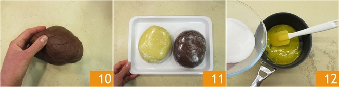 Legen Sie ihn wieder auf die Arbeitsfläche und formen Sie ihn, ohne ihn mit den Händen zu stark zu erwärmen 10. Formen Sie dann zwei Kugeln, eine mit Kakao und eine weiße, wickeln Sie sie in Frischhaltefolie 11 und lassen Sie sie mindestens 30 Minuten im Kühlschrank ruhen. Bereiten Sie in der Zwischenzeit die Vanillecreme vor. Geben Sie den Zucker und die Eigelbe 12 in einen Topf.