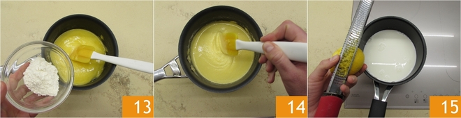 Vermischen Sie sie mit einem Spatel, damit keine Luft eingearbeitet wird, dann fügen Sie das Mehl 13 hinzu. Rühren Sie weiterhin mit dem Spatel 14. In einem anderen Topf den Milch und geriebene Zitronenschale 15 geben. Zum Kochen bringen.