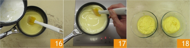 Sobald die Milch zu kochen beginnt, eine kleine Menge auf die Eiermasse 16 gießen und mit einem Spatel umrühren. Die gesamte Milch gießen, mit Spatel oder Schneebesen umrühren und zurück auf den Herd stellen. Kochen 17, bis die Creme eindickt und fast anfängt zu kochen. Teilen Sie die Creme in zwei gleiche Teile und geben Sie sie in zwei separate Schüsseln 18.