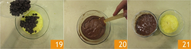 Fügen Sie die gehackte Schokolade in eine der beiden Schüsseln 19 hinzu, gut mit einem Spatel oder Schneebesen verrühren, bis sie geschmolzen ist und eine homogene Masse 20 entsteht. Decken Sie beide Cremes mit Frischhaltefolie ab 21 und lassen Sie sie etwa 1 Stunde im Kühlschrank abkühlen.
