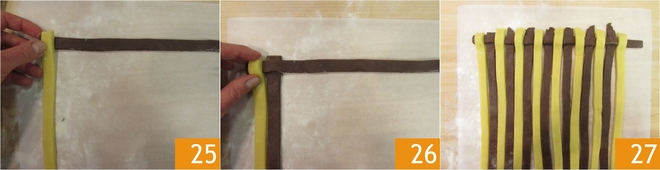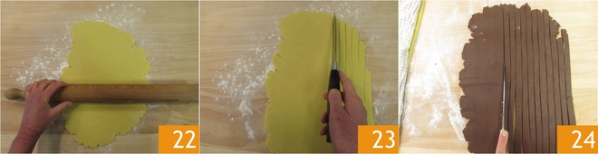 Wenn die Creme abgekühlt ist und der Mürbeteig geruht hat, können Sie Ihre Torte zusammenstellen. Rollen Sie zuerst den weißen Mürbeteig aus, bis Sie ein Rechteck von etwa 3-4 mm Dicke 22 erhalten. Daraus schneiden Sie Streifen von etwa 1 cm Breite 23. Wiederholen Sie den gleichen Vorgang auch für den Kakaomürbeteig 24.
