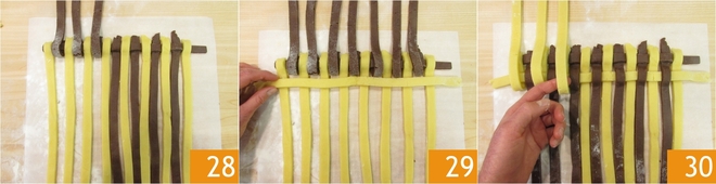 Heben Sie in diesem Moment vorsichtig alle Kakaostreifen 28 an, um auf den weißen Streifen einen weiteren weißen Streifen 29 zu legen. Dann legen Sie die Kakaostreifen wieder hin und heben diesmal die weißen Streifen 30 an.