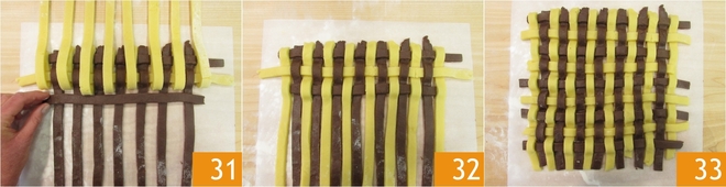 Jetzt legen Sie einen Kakaostreifen horizontal 31, klappen die weißen Streifen wieder in Position 32 und fahren auf diese Weise fort, indem Sie die Farben abwechseln, bis Sie Ihr Geflecht 33 fertigstellen und ein Quadrat erhalten.