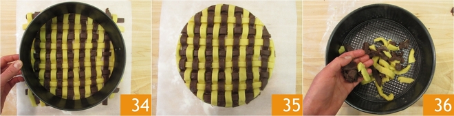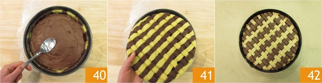 Übertragen Sie die Schokoladencreme auf die klassische und glätten Sie sie mit der Rückseite eines Löffels 40. Legen Sie den zweifarbigen Mürbeteigdeckel, den Sie im Kühlschrank aufbewahrt haben, sehr vorsichtig auf die Creme 41 und drücken Sie die Ränder leicht an, damit sie an der Mürbeteighülle anhaften. Backen Sie in einem vorgeheizten statischen Ofen bei 170° für 45 Minuten. Dann den Ofen auf 180° stellen und weitere 15 Minuten backen. Herausnehmen 42 und vollständig abkühlen lassen, bevor Sie Ihre zweifarbige Torte servieren.