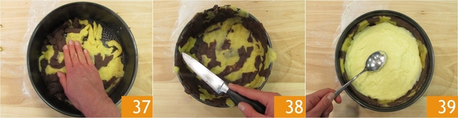 Drücken Sie sie gut mit den Händen direkt auf den Boden, um den Teig sowohl am Boden 37 als auch an den Rändern zu verteilen. Heben Sie ihn so hoch wie möglich, da er die beiden Cremes enthalten muss. Schneiden Sie mit einem kleinen Messer den überschüssigen Teig 38 ab. Gießen Sie zuerst die klassische Vanillecreme hinein, glätten Sie sie mit der Rückseite eines Löffels 39 und stellen Sie sie für 10 Minuten in den Kühlschrank.
