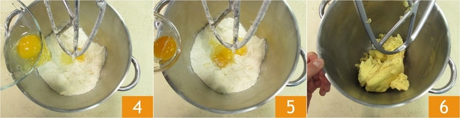 Schalten Sie die Küchenmaschine ein und arbeiten Sie etwa 2 Minuten lang. Fügen Sie die ganzen Eier 4 und die Eigelbe 5 hinzu. Schalten Sie die Maschine erneut ein und arbeiten Sie, bis Sie einen homogenen und kompakten Teig 6 erhalten haben.
