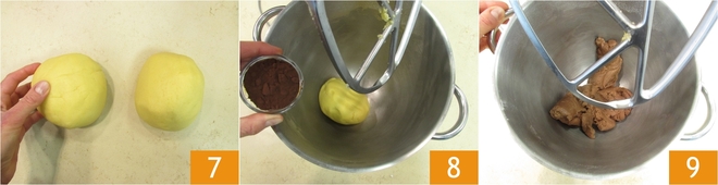 Übertragen Sie den Teig auf eine Arbeitsfläche, arbeiten Sie ihn kurz, um ihn zu verbinden, und teilen Sie ihn in zwei gleiche Teile 7. Geben Sie die eine Hälfte wieder in die Küchenmaschine und fügen Sie den ungesüßten Kakao 8 hinzu. Arbeiten Sie kurz mit dem Flachrührer, bis Sie einen einheitlich gefärbten Teig 9 erhalten.