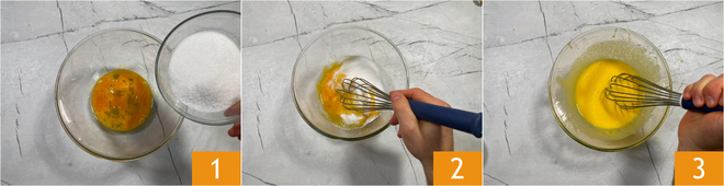 Für den zweifarbigen Plumcake die Eier in eine Schüssel schlagen, den Zucker 1 dazugeben und 5 Minuten mit einem Handschneebesen schlagen 23.