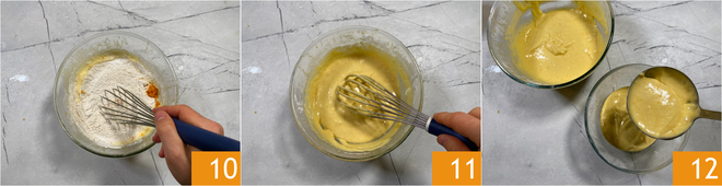Vorsichtig mit dem Handschneebesen verrühren 10, bis eine homogene Masse entsteht 11. Nun 300 g des gerade zubereiteten Teigs in eine andere Schüssel geben 12.