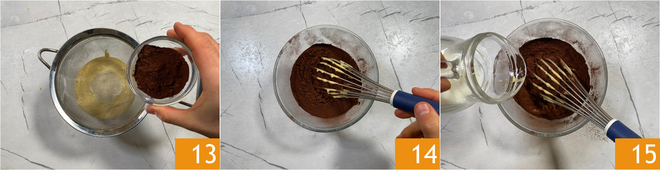 In diese Schüssel das gesiebte Kakaopulver geben 13 und mit dem Schneebesen verrühren 14, dabei die Milch in einem dünnen Strahl zugeben 15. Gut vermischen.