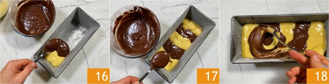 Eine Kastenform 23x11 cm, Höhe 7,5 cm, einfetten und bemehlen. 3 Esslöffel hellen Teig abwechselnd mit 2 Esslöffeln Kakaoteig hineingeben 16. Dann eine zweite Schicht anlegen, diesmal mit dem Kakaoteig beginnend und 3 Esslöffel dunklen Teigs mit 2 Esslöffeln hellem Teig abwechseln 17. Sobald der Teig eingefüllt ist, mit einer Gabel das marmorierte Muster erzeugen, indem ihr von unten nach oben fahrt und vorsichtig vermischt 18.