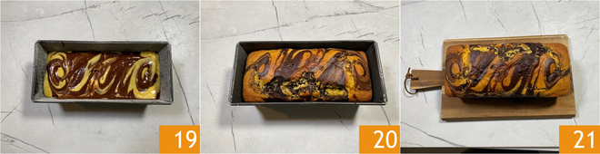 Wenn ihr das gewünschte Muster erreicht habt 19, den zweifarbigen Plumcake in einem vorgeheizten Backofen (Ober-/Unterhitze) bei 180° etwa 40–45 Minuten backen. Vor dem Herausnehmen mit dem Holzstäbchen testen 20. Abkühlen lassen und servieren 21.