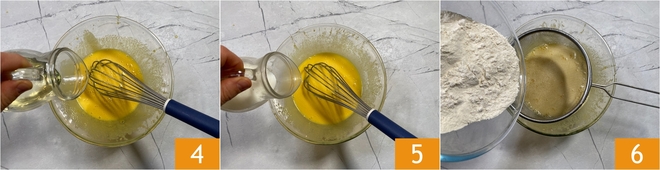 Das Öl in einem dünnen Strahl zugeben, während weiter mit dem Schneebesen gerührt wird 4. Danach die Milch ebenfalls in einem dünnen Strahl zugeben 5 und anschließend das Mehl hinein sieben 6.