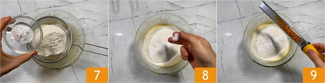 Auch das Backpulver sieben 7, Salz hinzufügen 8 und die geriebene Orangenschale beifügen 9.
