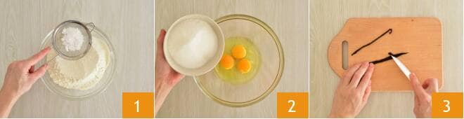 Um den zweifarbigen Schokoladenkranz zuzubereiten, siebt zuerst das Mehl in eine Schüssel und dann das Backpulver 1. Nehmt die Eier und gebt sie in eine Schüssel, fügt den Zucker hinzu 2. Nehmt die halbe Vanilleschote und kratzt mit einem Messer die Samen heraus 3.