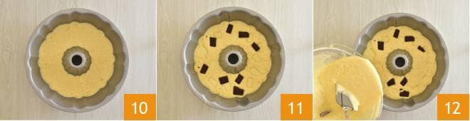 und gebt die Hälfte des Teigs hinein 10. Fügt 40 g dunkle Schokolade und 40 g weiße Schokolade in Würfeln hinzu 11. Deckt mit dem restlichen Teig ab 12