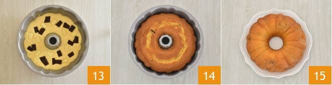 und fügt weitere 40 g dunkle Schokolade und 40 g weiße Schokolade hinzu 13. Backt bei 180° für 45 Minuten. Dann nehmt den Kuchen aus dem Ofen 14, lasst ihn abkühlen, nehmt ihn aus der Form und legt ihn auf eine Servierplatte.