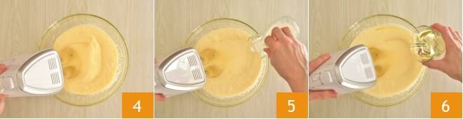 Gebt sie in die Schüssel mit Eiern und Zucker und beginnt mit einem Handmixer zu schlagen, bis eine schaumige und helle Masse entsteht 4. Gießt zuerst die Milch bei Raumtemperatur in einem dünnen Strahl hinzu 5 und dann das Öl, indem ihr die Geschwindigkeit reduziert 6.