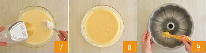 Gebt nach und nach das mit Backpulver vermischte Mehl hinzu und schlagt weiter bei niedriger Geschwindigkeit 7, bis ihr eine glatte, klumpenfreie Masse erhaltet 8. Fettet eine 26 cm große Kranzform ein 9