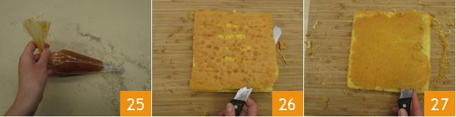 Die Marmelade in einen Spritzbeutel füllen 25, so lässt sich der Kuchen leichter füllen. Wenn beide Kuchen vollständig kalt sind, schälen Sie die äußere Kruste oben und unten ab (26-27), um den Kern freizulegen.