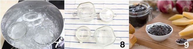 Kümmern Sie sich nun um die Sterilisation der Gläser (7-8): Folgen Sie den Anweisungen des Gesundheitsministeriums am Ende des Rezepts. Füllen Sie das Tropea-Zwiebelkompott mit Balsamico in die Gläser, dabei 2-3 cm Platz zum Rand lassen, und verschließen Sie die Gläser gut. Nachdem Sie das Kompott in die Gläser gefüllt haben, verschließen Sie sie und führen Sie das Abkochen, also die Pasteurisierung, durch, wobei Sie stets die Richtlinien des Ministeriums einhalten. Überprüfen Sie abschließend, ob das Vakuum richtig gebildet wurde: Wenn Sie beim Drücken auf den Deckel kein "Click Clack" hören, bedeutet das, dass das Vakuum korrekt ist. Sobald das Tropea-Zwiebelkompott mit Balsamico fertig ist, bewahren Sie es an einem kühlen und trockenen Ort auf und servieren Sie es in einer Schale zusammen mit einem guten, gereiften Käse 9.